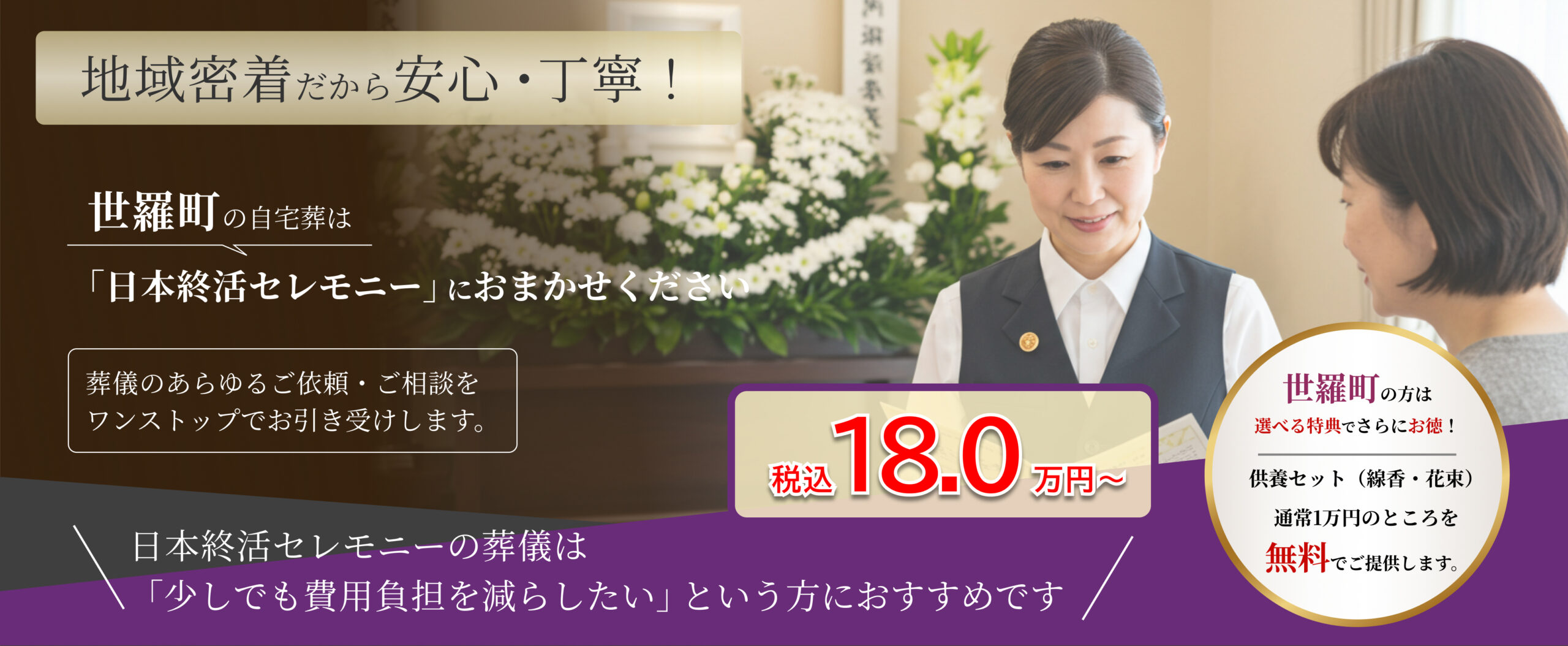 自宅葬プランは18万円(税込)からご用意しております。会場費がかからない分、ご予算を抑えることができます。明朗会計で、追加費用の心配もありません。お見積もりは無料ですので、まずはお気軽にご相談ください。